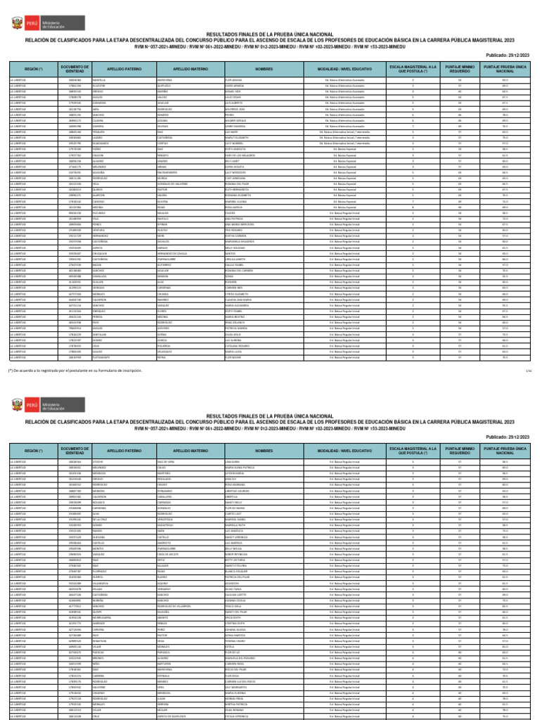 RELACIÓN DE CLASIFICADOS PARA LA ETAPA DESCENTRALIZADA DEL CONCURSO PÚBLICO PARA EL ASCENSO DE ESCALA DE LOS PROFESORES DE EDUCACIÓN BÁSICA EN LA CARRERA PÚBLICA MAGISTERIAL 2023