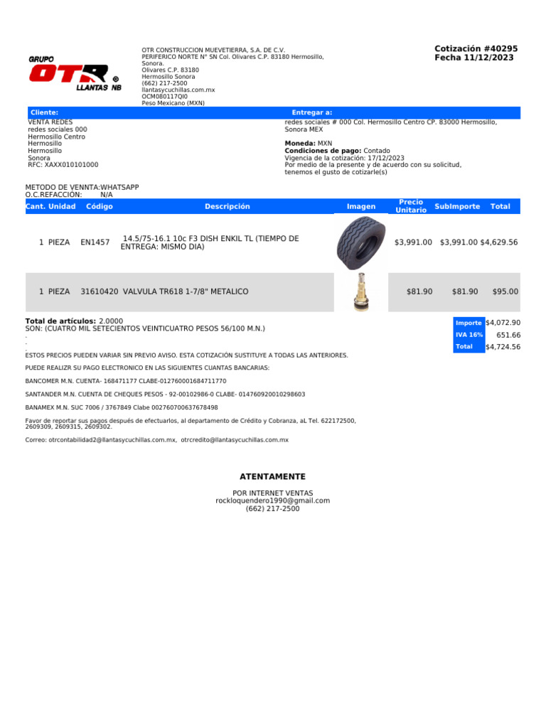 Correo: otrcontabilidad2@llantasycuchillas.com.mx, otrcredito@llantasycuchillas.com.mx