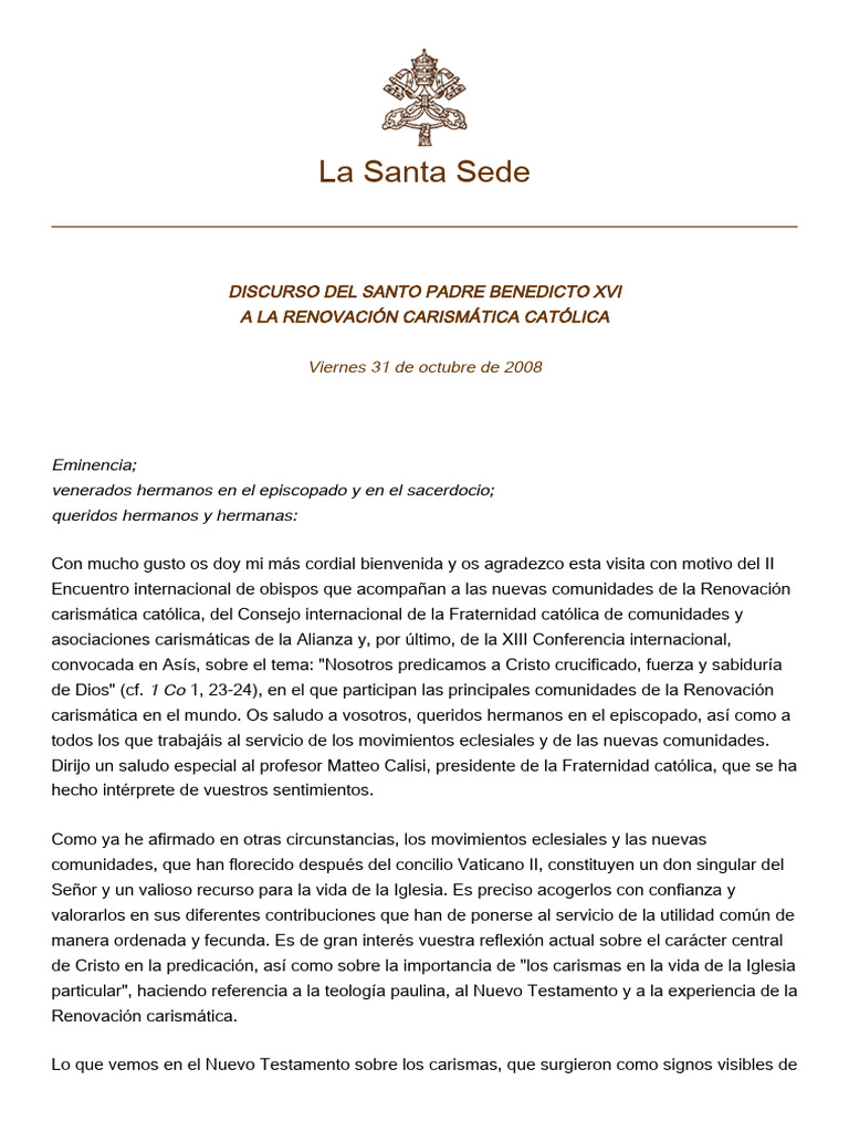 carismática en el mundo. Os saludo a vosotros, queridos hermanos en el episcopado, así como a