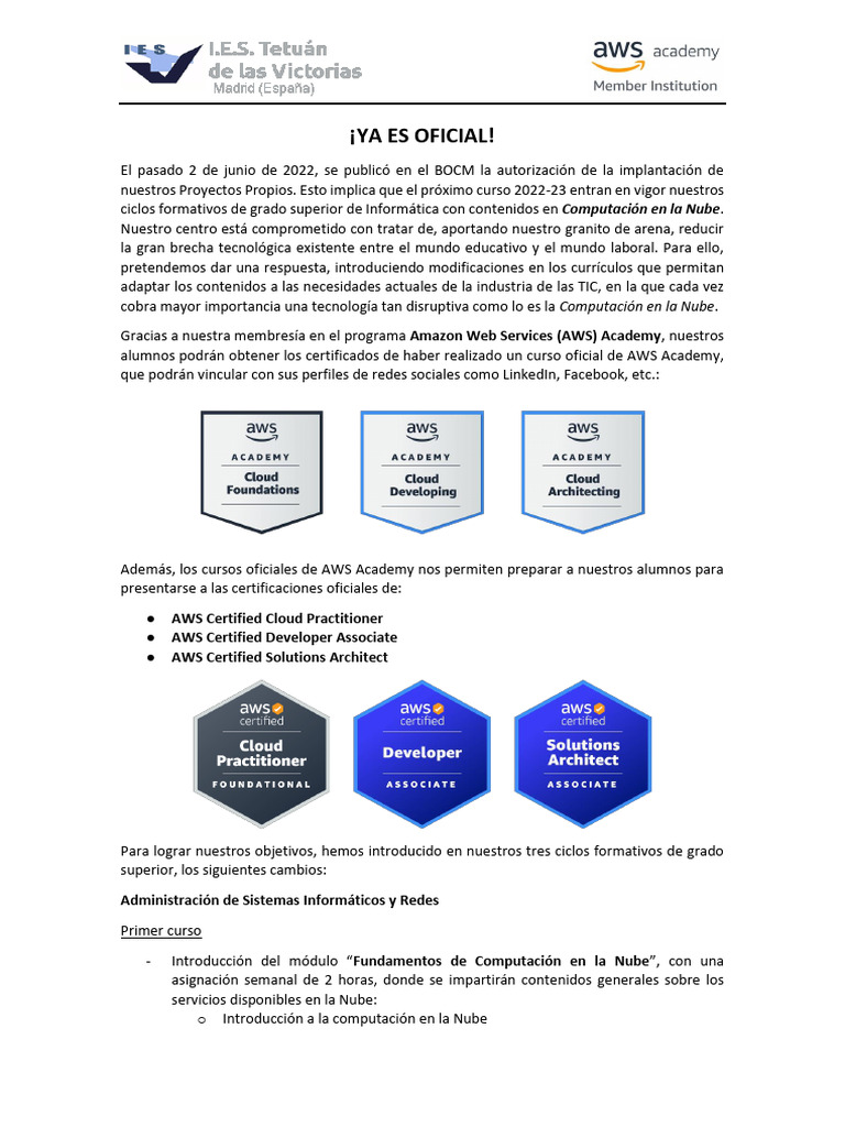 Además, los cursos oficiales de AWS Academy nos permiten preparar a nuestros alumnos para
