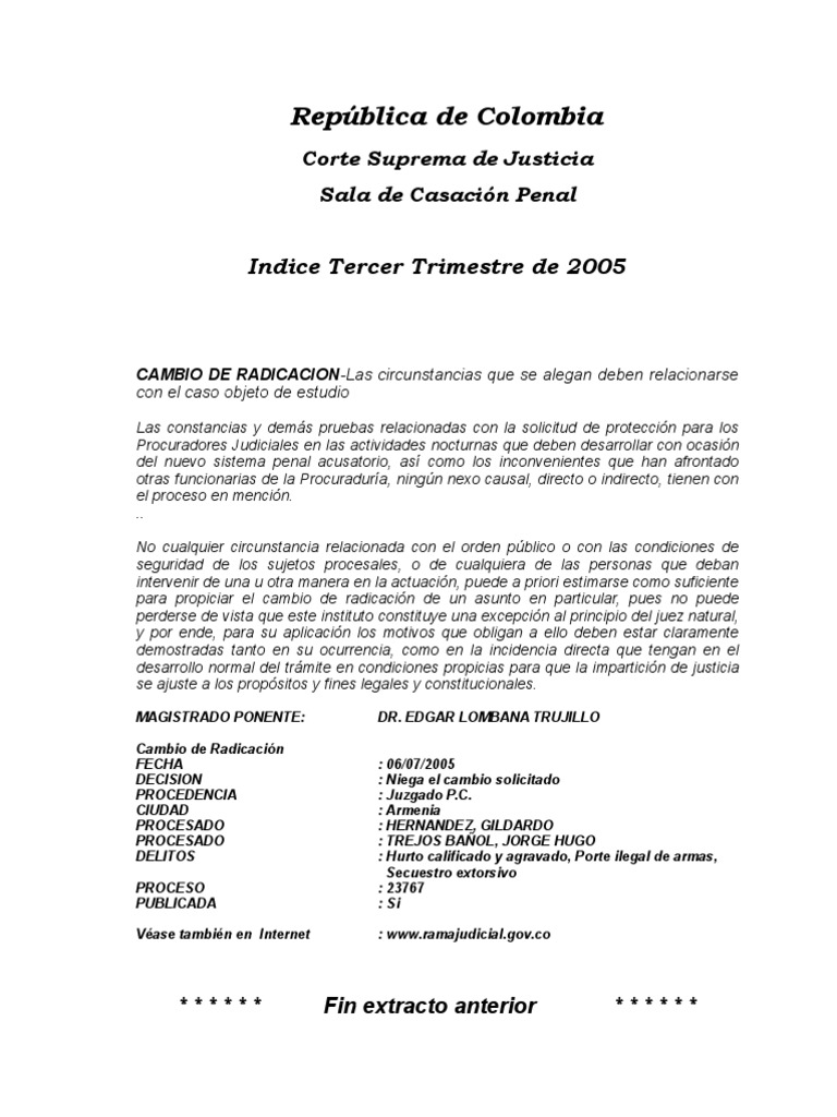 Relatoría Sala de Casación Penal Tercer Trimestre de 2005