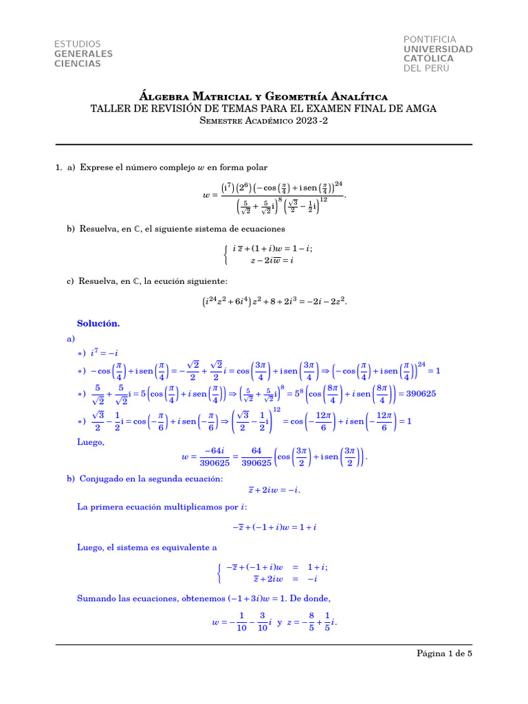TALLER DE REVISIÓN DE TEMAS PARA EL EXAMEN FINAL DE AMGA
