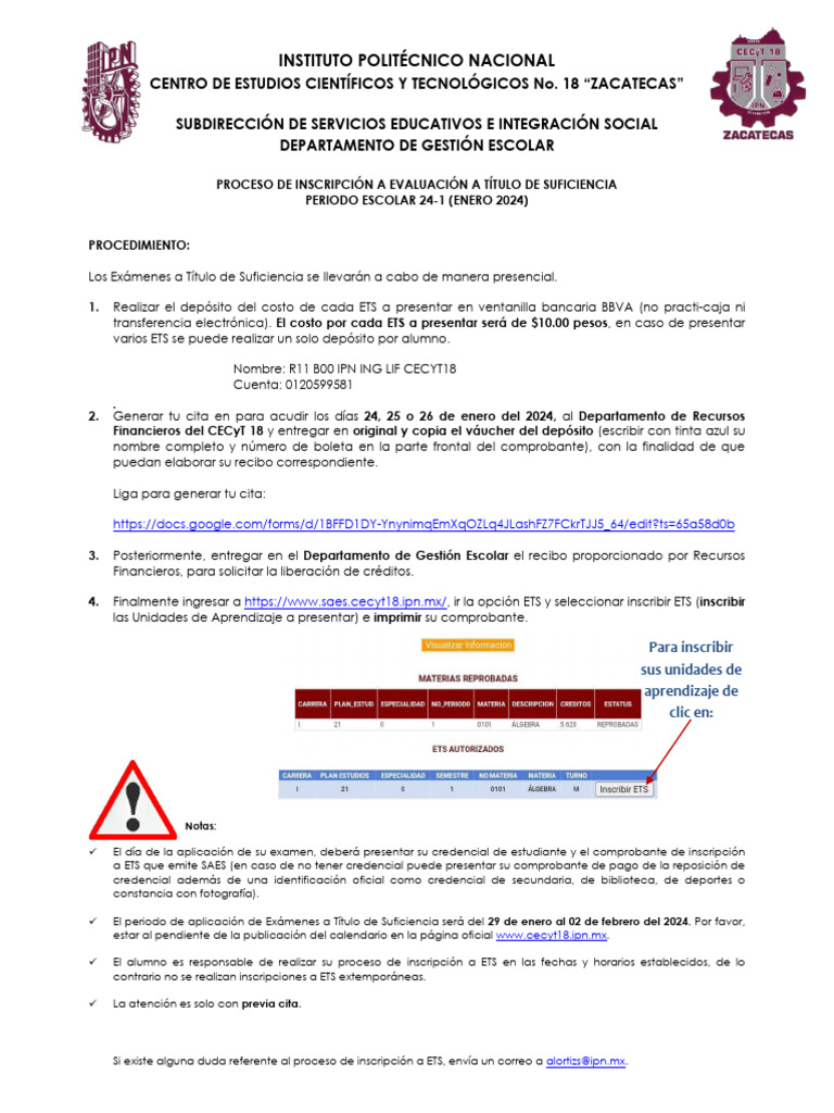 ✓ El alumno es responsable de realizar su proceso de inscripción a ETS en las fechas y horarios establecidos, de lo