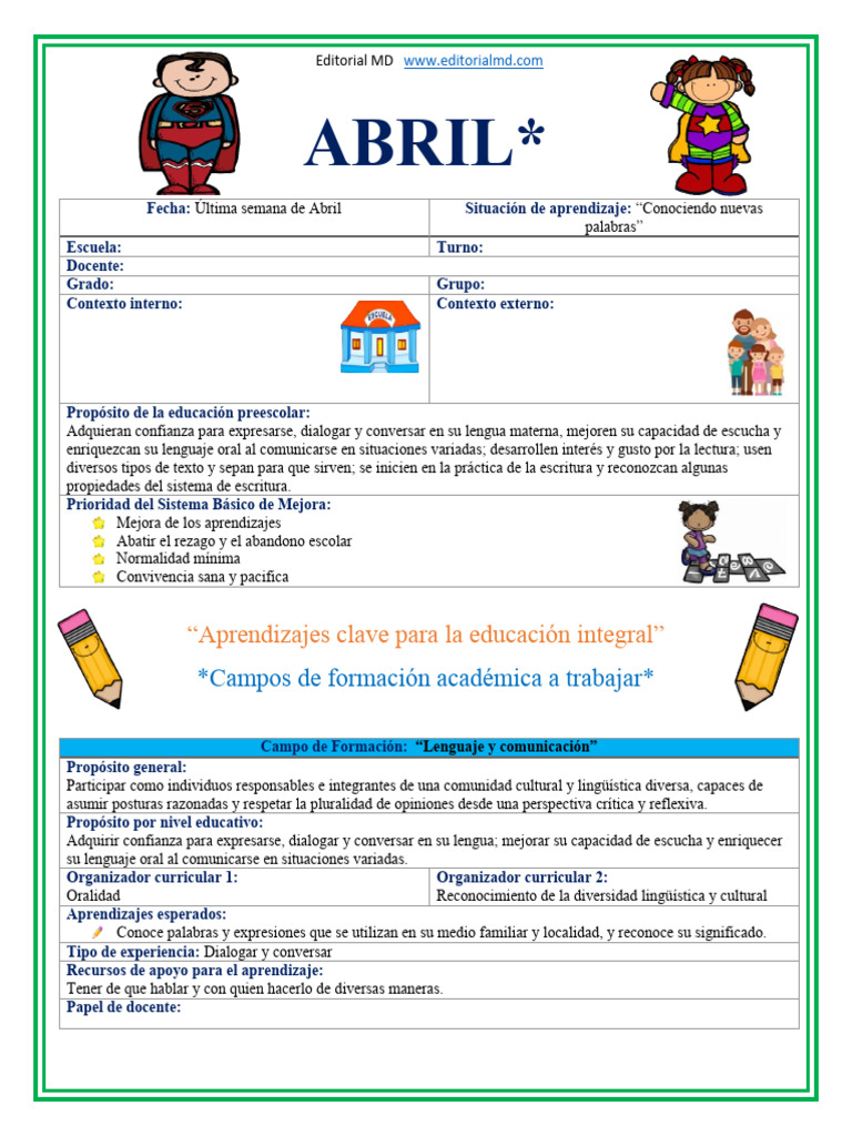 Fecha: Última semana de Abril Situación de aprendizaje: “Conociendo nuevas