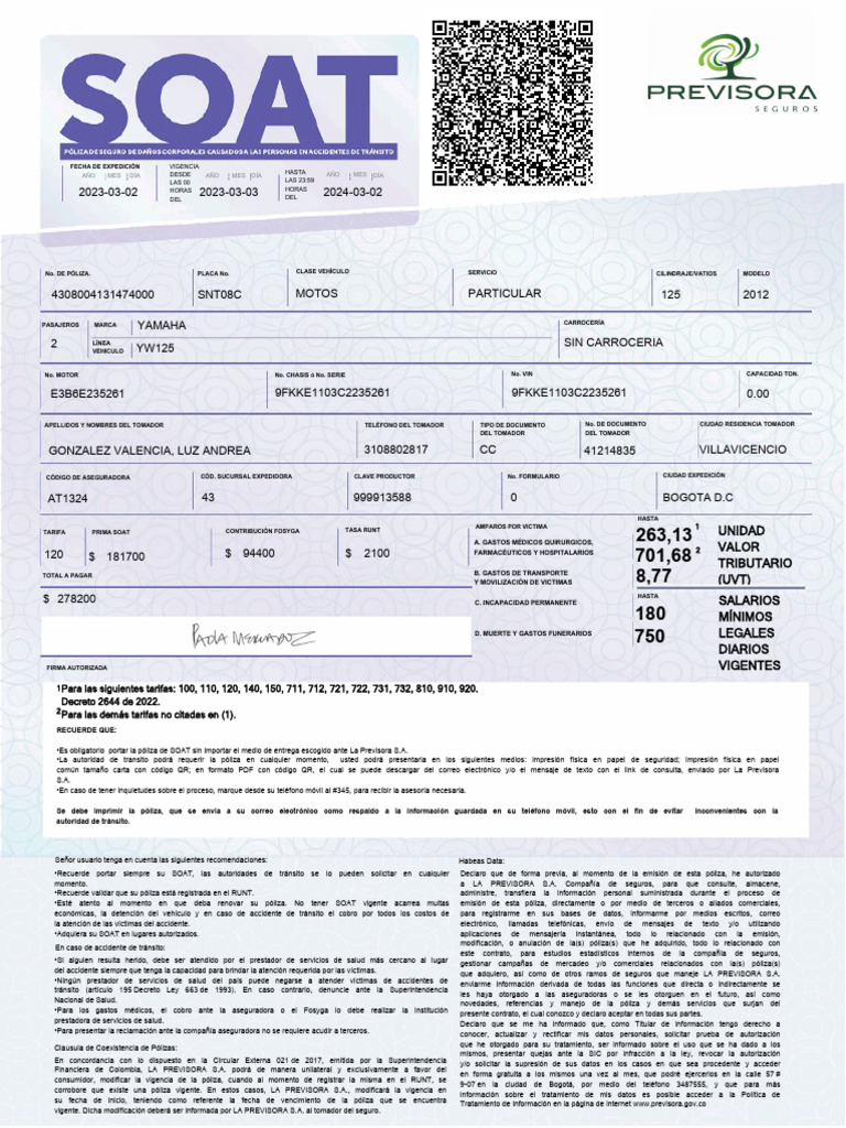 •Es obligatorio portar la póliza de SOAT sin importar el medio de entrega escogido ante La Previsora S.A.