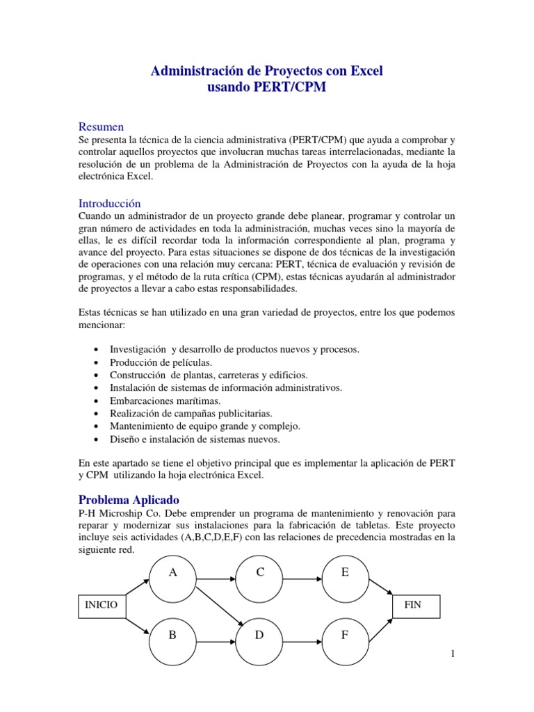Se presenta la tcnica de la ciencia administrativa (PERT/CPM) que ayuda a comprobar y controlar aquellos proyectos que involucran muchas tareas interrelacionadas, mediante la resolucin de un problema de la Administracin de Proyectos con la ayuda de la hoja electrnica Excel.