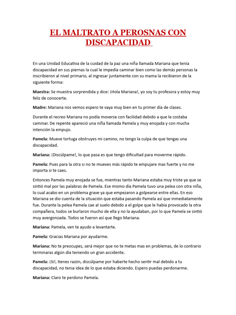 demás y hablo de su discapacidad, por lo que fue totalmente ignorada y se sintió excluida.