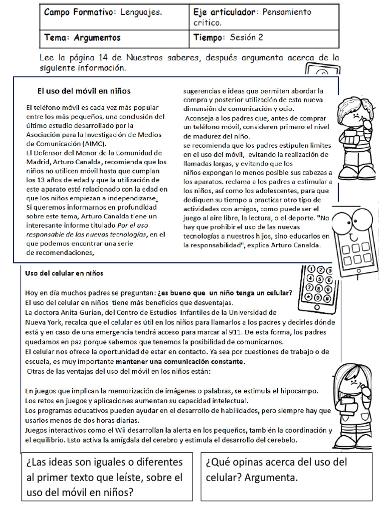 El documento discute dos preguntas sobre el uso del celular en niños y pide opiniones sobre el tema.