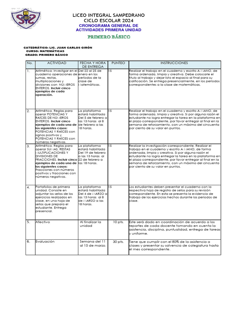 No. ACTIVIDAD FECHA Y HORA PUNTEO INSTRUCCIONES