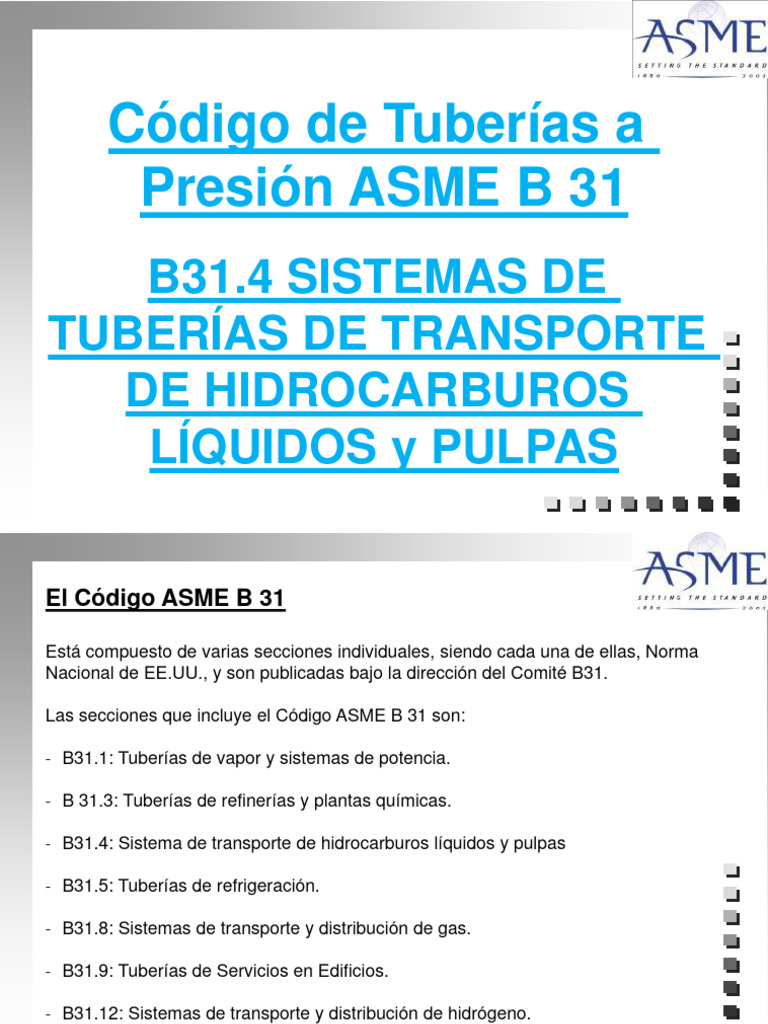- B31.4: Sistema de transporte de hidrocarburos líquidos y pulpas