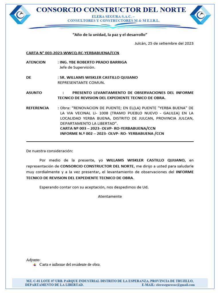 representación de CONSORCIO CONSTRUCTOR DEL NORTE, me dirijo a usted para saludarle