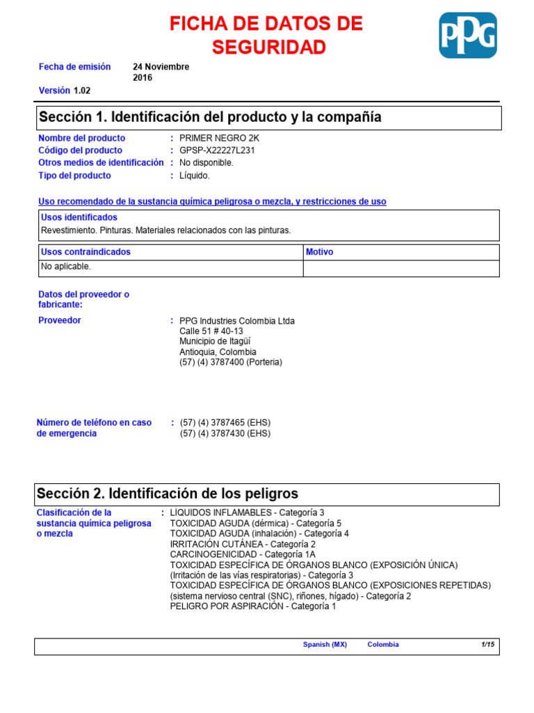 proporcionado por PPG, y para recomendar medidas preventivas para el almacenamiento y manejando de los