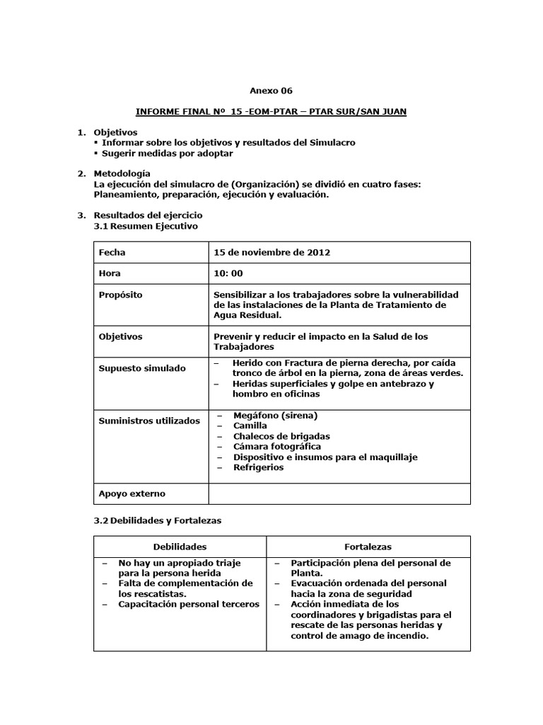3.1 Resumen Ejecutivo Se hace una descripción del simulacro realizado,