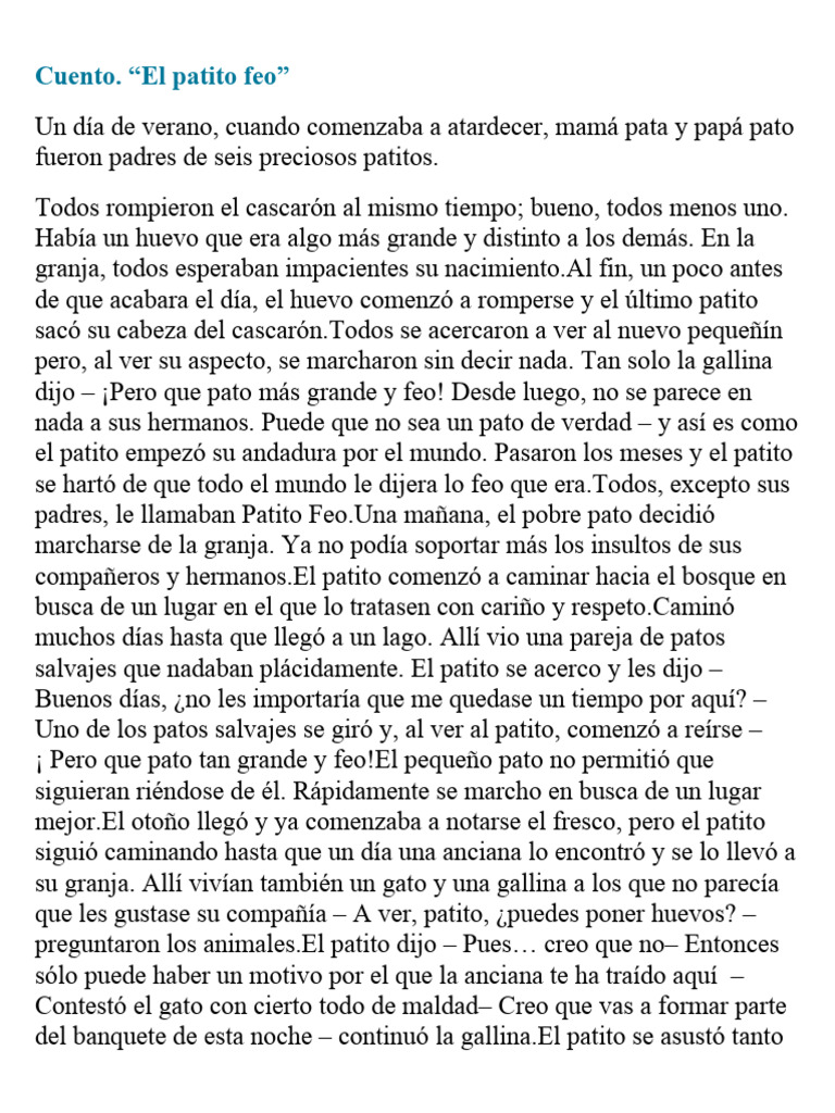 padres, le llamaban Patito Feo.Una mañana, el pobre pato decidió