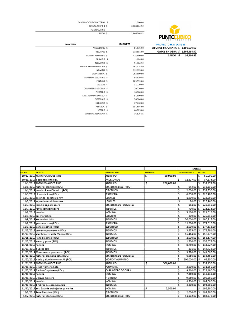 1/2/2020 viajes valastre arena y jal CP lote 36 mm INSUMOS $ 11,900.00 $ 58,105.00