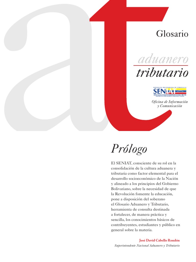 El SENIAT, consciente de su rol en la consolidacin de la cultura aduanera y tributaria como factor elemental para el desarrollo socioeconmico de la Nacin y alineado a los principios del Gobierno Bolivariano, sobre la necesidad de que la Revolucin fomente la educacin, pone a disposicin del soberano el Glosario Aduanero y Tributario, herramienta de consulta destinada a fortalecer, de manera prctica y sencilla, los conocimientos bsicos de contribuyentes, estudiantes y pblico en general sobre la materia.