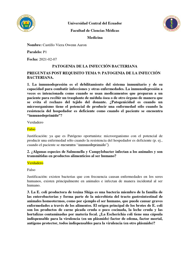 PREGUNTAS POST REQUISITO TEMA 9: PATOGENIA DE LA INFECCIÓN