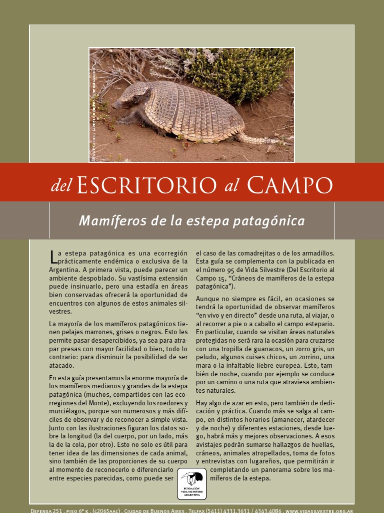 el caso de las comadrejitas o de los armadillos. Esta gua se complementa con la publicada en el nmero 95 de Vida Silvestre (Del Escritorio al Campo 15, Crneos de mamferos de la estepa patagnica). Aunque no siempre es fcil, en ocasiones se tendr la oportunidad de observar mamferos en vivo y en directo desde una ruta, al viajar, o al recorrer a pie o a caballo el campo estepario. En particular, cuando se visitan reas naturales protegidas no ser rara la ocasin para cruzarse con una tropilla de guanacos, un zorro gris, un peludo, algunos cuises chicos, un zorrino, una mara o la infaltable liebre europea. Esto, tambin de noche, cuando por ejemplo se conduce por un camino o una ruta que atraviesa ambientes naturales. Hay algo de azar en esto, pero tambin de dedicacin y prctica. Cuando ms se salga al campo, en distintos horarios (amanecer, atardecer y de noche) y diferentes estaciones, desde luego, habr ms y mejores observaciones. A esos avistajes podrn sumarse hallazgos de huellas, crneos, animales atropellados, toma de fotos y entrevistas con lugareos, que permitirn ir completando un panorama sobre los mamferos de la estepa.
