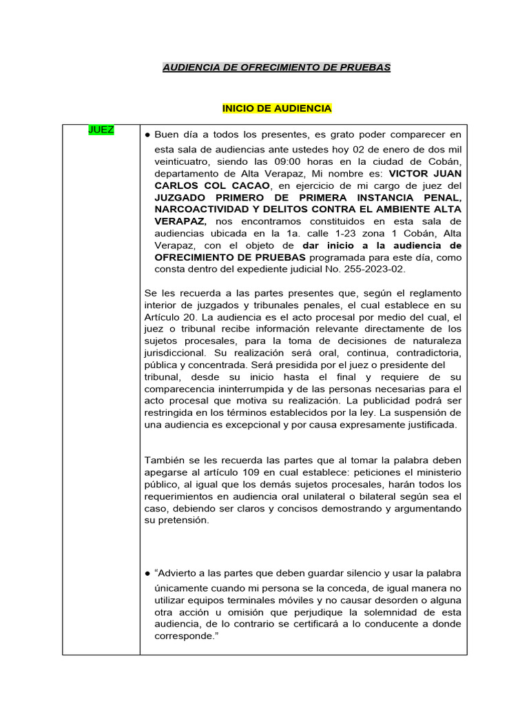 Verapaz, con el objeto de dar inicio a la audiencia de