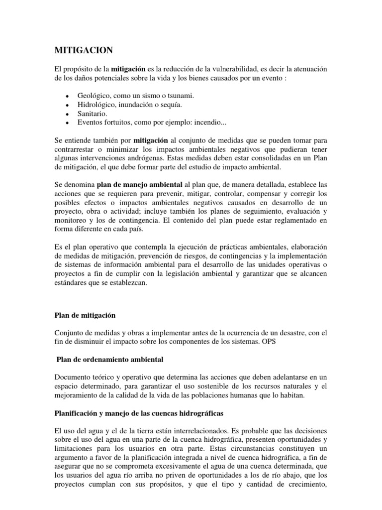 Se entiende tambin por mitigacin al conjunto de medidas que se pueden tomar para contrarrestar o minimizar los impactos ambientales negativos que pudieran tener algunas intervenciones andrgenas. Estas medidas deben estar consolidadas en un Plan de mitigacin, el que debe formar parte del estudio de impacto ambiental. Se denomina plan de manejo ambiental al plan que, de manera detallada, establece las acciones que se requieren para prevenir, mitigar, controlar, compensar y corregir los posibles efectos o impactos ambientales negativos causados en desarrollo de un proyecto, obra o actividad; incluye tambin los planes de seguimiento, evaluacin y monitoreo y los de contingencia. El contenido del plan puede estar reglamentado en forma diferente en cada pas. Es el plan operativo que contempla la ejecucin de prcticas ambientales, elaboracin de medidas de mitigacin, prevencin de riesgos, de contingencias y la implementacin de sistemas de informacin ambiental para el desarrollo de las unidades operativas o proyectos a fin de cumplir con la legislacin ambiental y garantizar que se alcancen estndares que se establezcan.