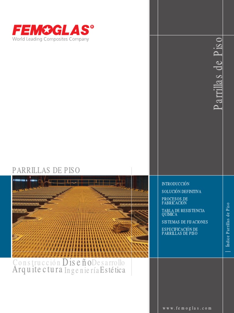 SOLUCIN DEFINITVA Con ms de 50 aos de presencia en el mercado, Femoglas consolida su liderazgo en la fabricacin y comercializacin de Parrillas de Piso en Plstico Reforzado con Fibras de Vidrio (PRFV). Combinando una gran resistencia a la corrosin con una excelente resis-tencia mecnica, adems de una prolongada vida til y seguridad, Femoglas, ha fijado la norma a seguir en la fabricacin de las parrillas de Plstico Reforzado con Fibras de Vidrio. stas han demostrado ser la alternativa ms durable y confiable, incluso bajo condiciones severas de corrosin. Femoglas cuenta con ms de 16 modelos diferentes de parrillas con dos sistemas de fabricacin: pultruidas y modeladas por inyeccin. Ambos tipos de parrillas son livianas y fciles de instalar. Las parrillas de Plstico Reforzado con Fibras de Vidrio Femoglas, son superiores a las metlicas convencionales, puesto que se basan en un diseo que permite un alto nivel de resistencia a la corro-sin, larga vida til y no requieren de mantencin. Gracias a que las parrillas pesan menos de la mitad que las de acero y son simples de fabricar, resulta menos costosa su instalacin. Por el contrario, las de acero requieren de costosos procesos de corte y soldadura que, adems, tardan largo tiempo, junto con la utilizacin de equipo especial de levantamiento. En cambio las parrillas Femoglas requieren menos horas hombre y slo herramientas manuales simples para su instalacin. El ahorro de mano de obra y equipo, a menudo reduce considerable-mente el costo. disposicin de los usuarios ms de 16 modelos diferentes de parrillas de piso, proporcionadas por solicitud especfica o en mdulos standard. Pueden fabricarse de acuerdo a las condiciones de operacin en sistemas de resinas polister y/o Vinilster u otra. Las parrillas Femoglas pueden tambin fabricarse retardantes al fuego, cumpliendo con la Norma ASTM E-84 Clase 1.
