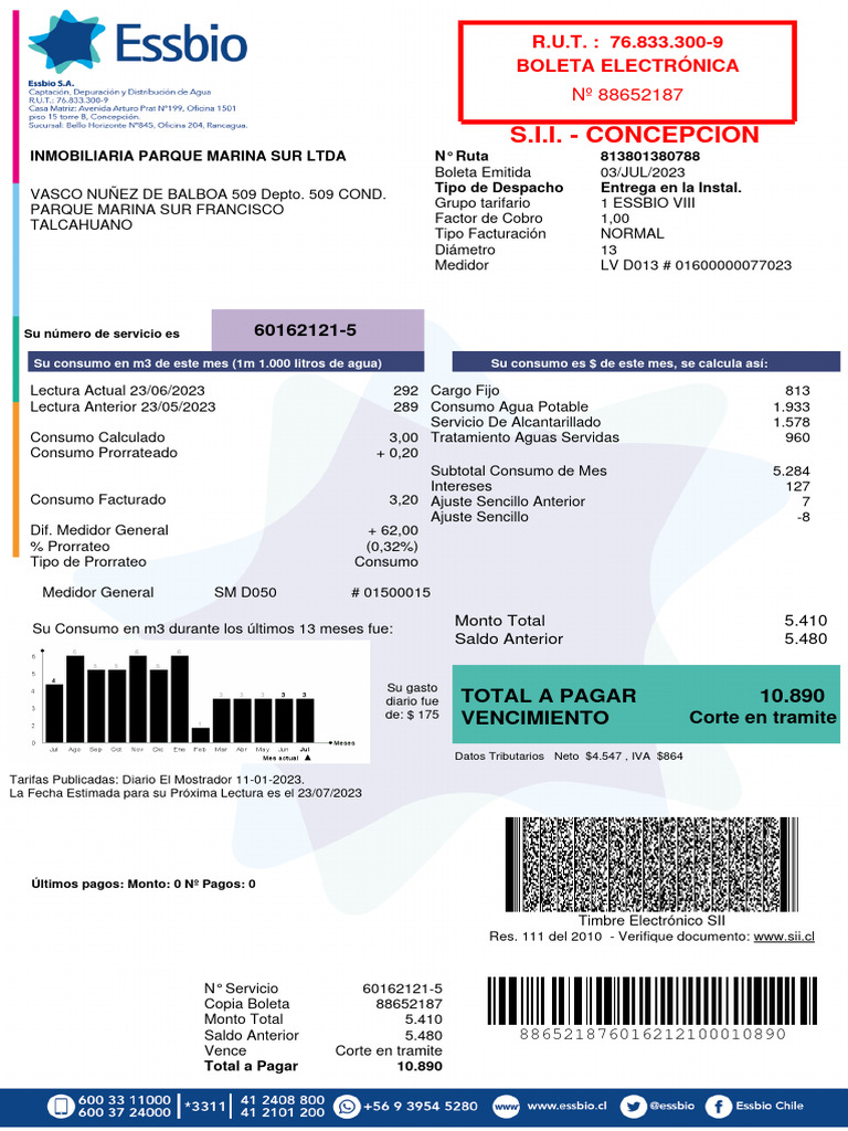 Lectura Anterior 23/05/2023 289 Consumo Agua Potable 1.933