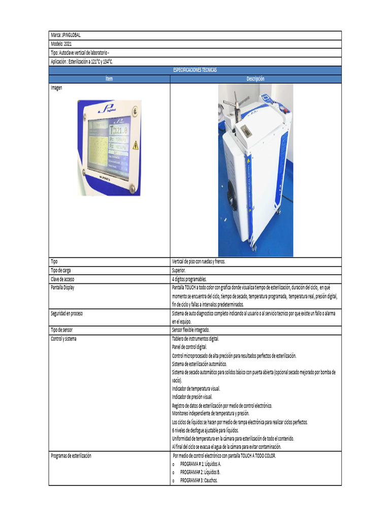 Especificaciones: Autoclave vertical automática / Capacidad 40 Litros /Pantalla Touch a todo color 3.5” / Sensor flexible / Bandeja en acero