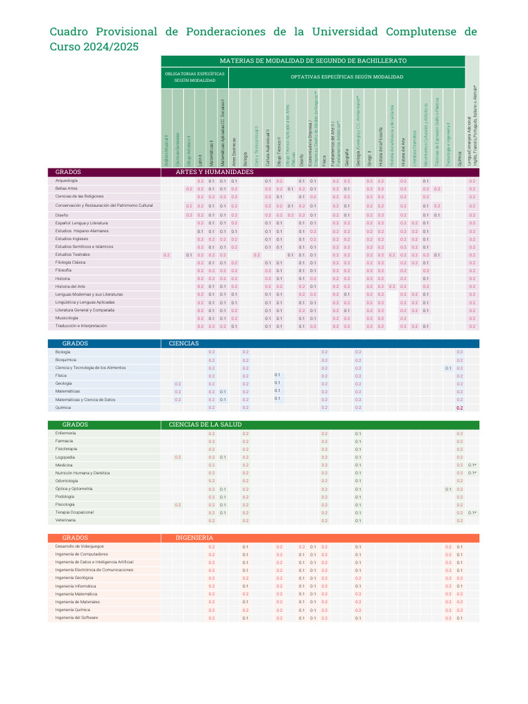 Cuadro Provisional de Ponderaciones de la Universidad Complutense de