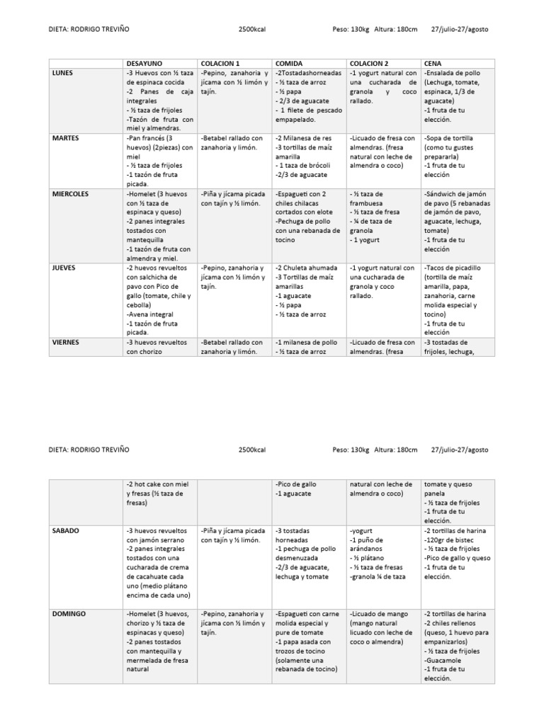 DIETA: RODRIGO TREVIÑO 2500kcal Peso: 130kg Altura: 180cm 27/julio-27/agosto