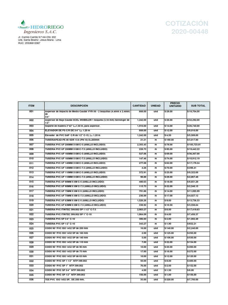 023 TUBERIA PVC SP 3/4" C-10 386.60 m S/2.80 S/1,082.48