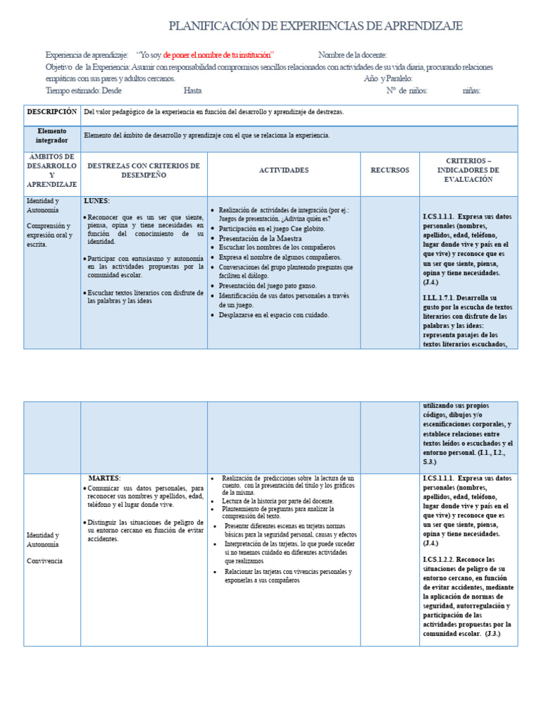 PLANIFICACIÓN DE EXPERIENCIAS DE APRENDIZAJE