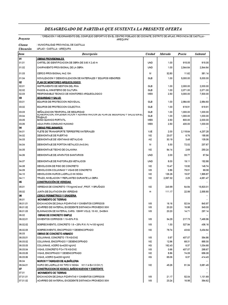 DESAGREGADO DE PARTIDAS QUE SUSTENTA LA PRESENTE OFERTA