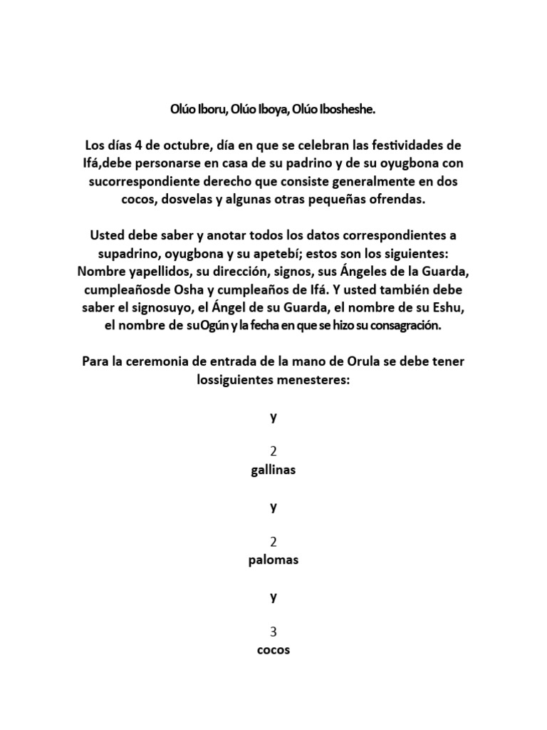 Para la ceremonia de entrada de la mano de Orula se debe tener
