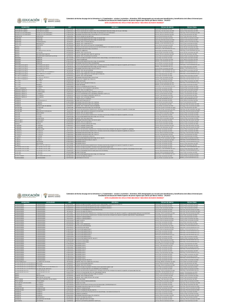 Calendario de fechas de pago de los bimestres 4 y 5 (septiembre - octubre | noviembre - diciembre, 2021) desagregado por escuela para beneficiarias y beneficiarios de la Beca Universal para