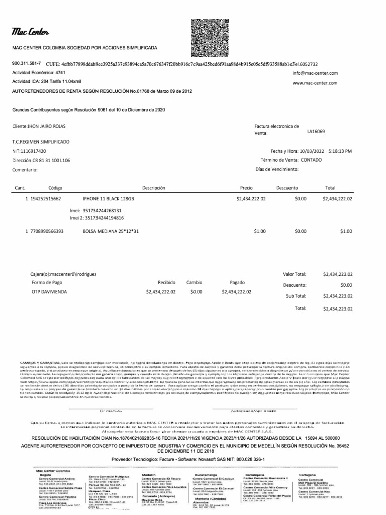 Cliente:JHON JAIRO ROJAS Factura electronica de