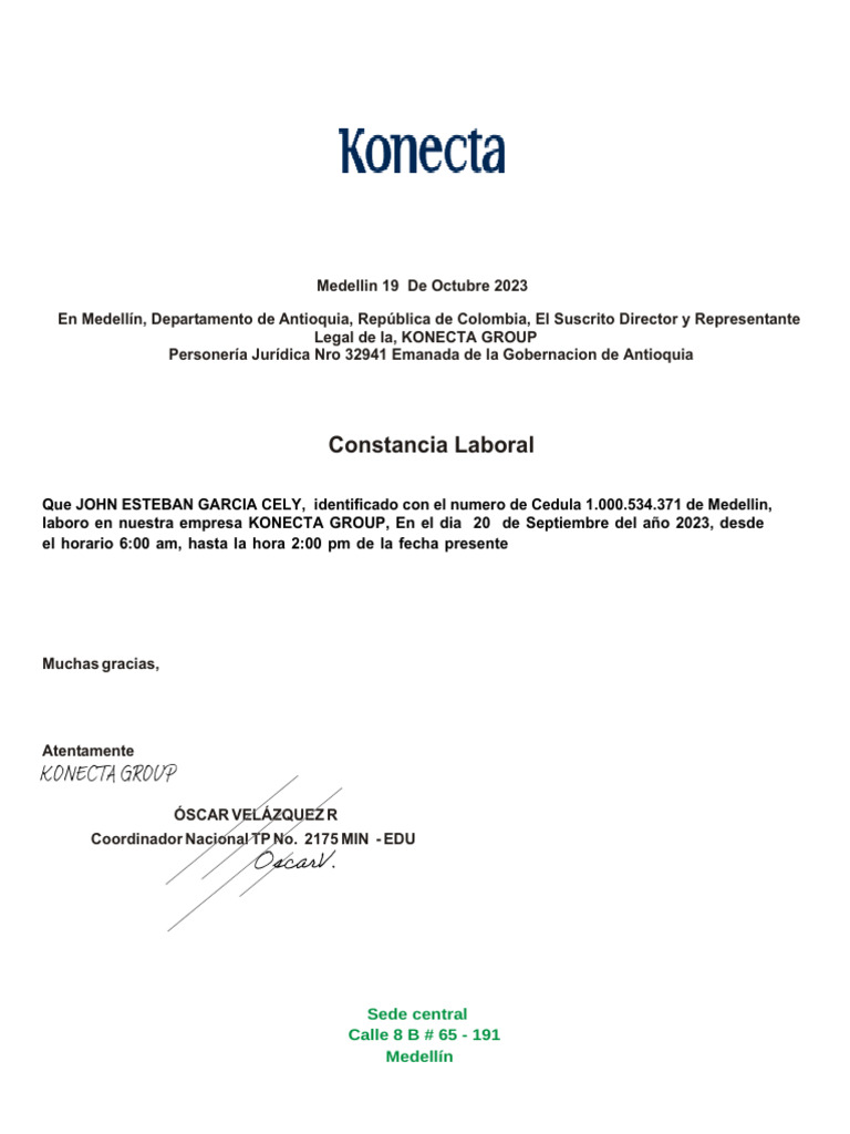 laboro en nuestra empresa KONECTA GROUP, En el dia 20 de Septiembre del año 2023 , desde