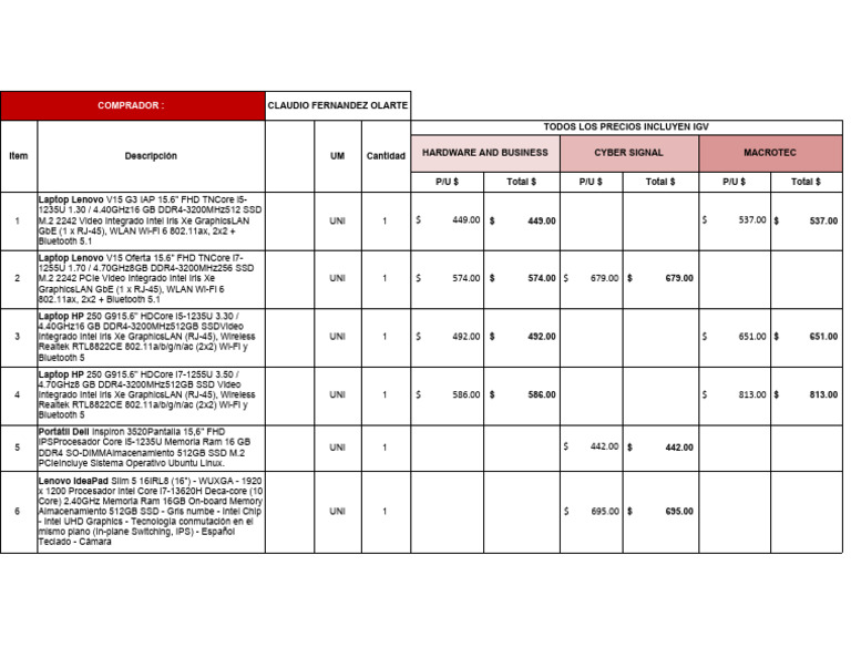 Item Descripción UM Cantidad HARDWARE AND BUSINESS CYBER SIGNAL MACROTEC