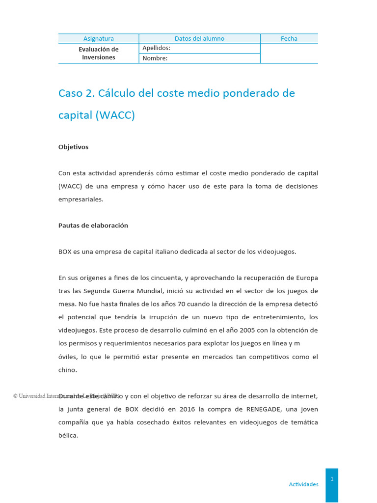 necesitas realizar una estimación del WACC de BOX. Esta estimación se usará como
