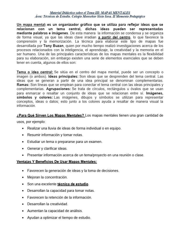 Área: Técnicas de Estudio. Colegio Monseñor Sixto Sosa. II Momento Pedagógico