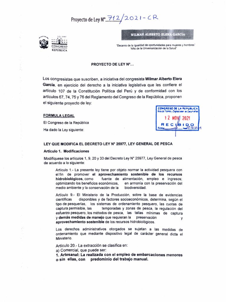 Artículo 1 La presente ley tiene por objeto normar la actividad pesquera con