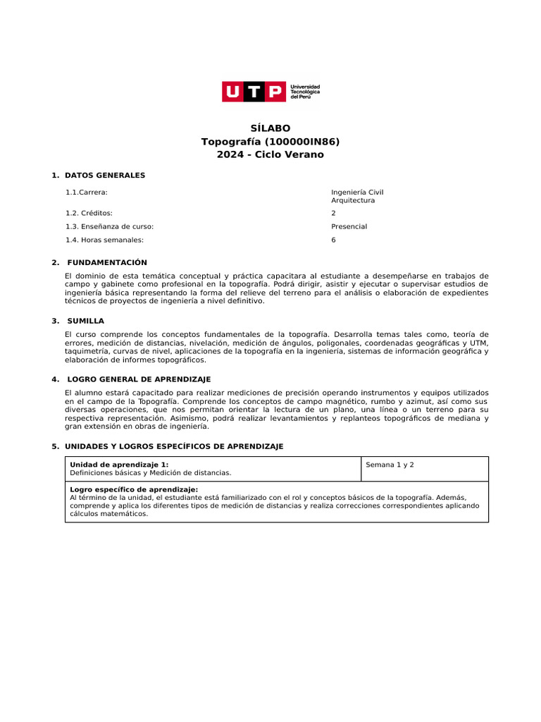 Al término de la unidad, el estudiante está familiarizado con el rol y conceptos básicos de la topografía. Además,