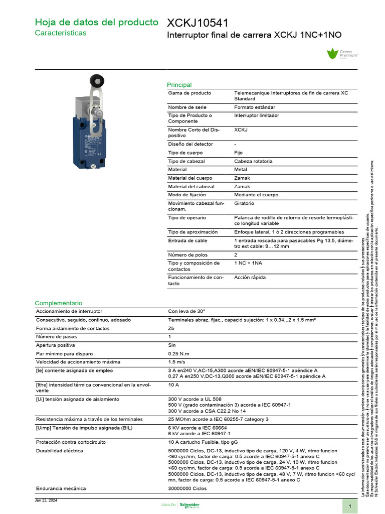 Características Interruptor final de carrera XCKJ 1NC+1NO