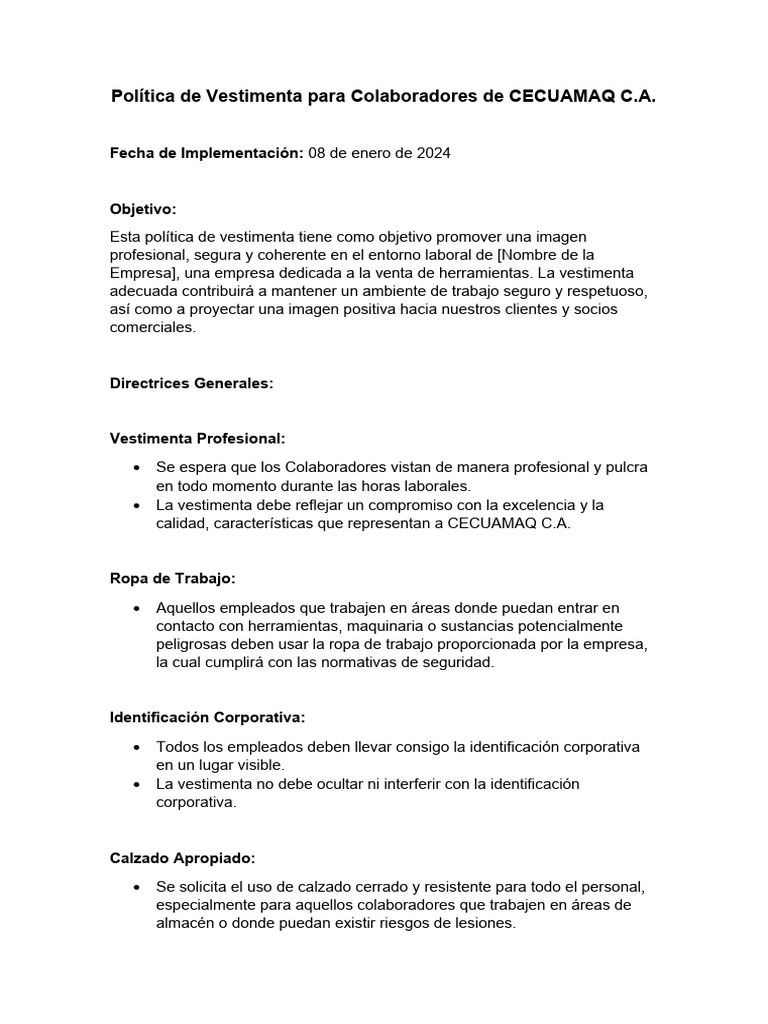 Política de Vestimenta para Colaboradores de CECUAMAQ C.A.