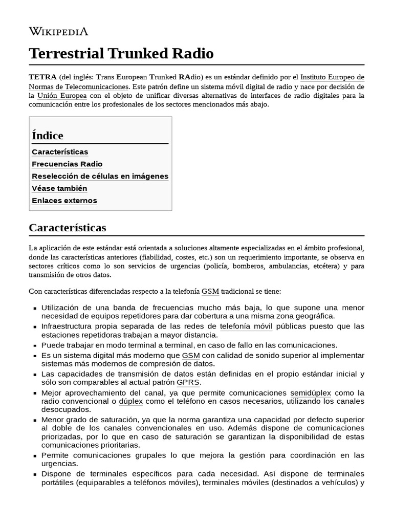 TETRA (del inglés: Trans European Trunked RAdio) es un estándar definido por el Instituto Europeo de