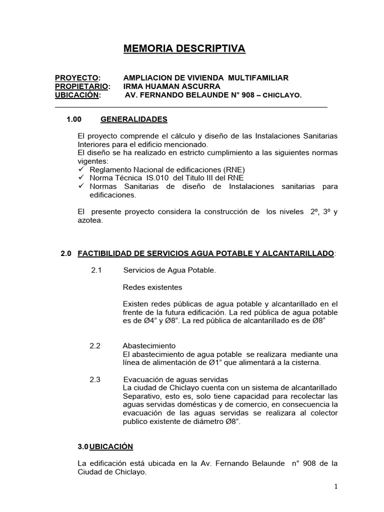El proyecto comprende el cálculo y diseño de las Instalaciones Sanitarias