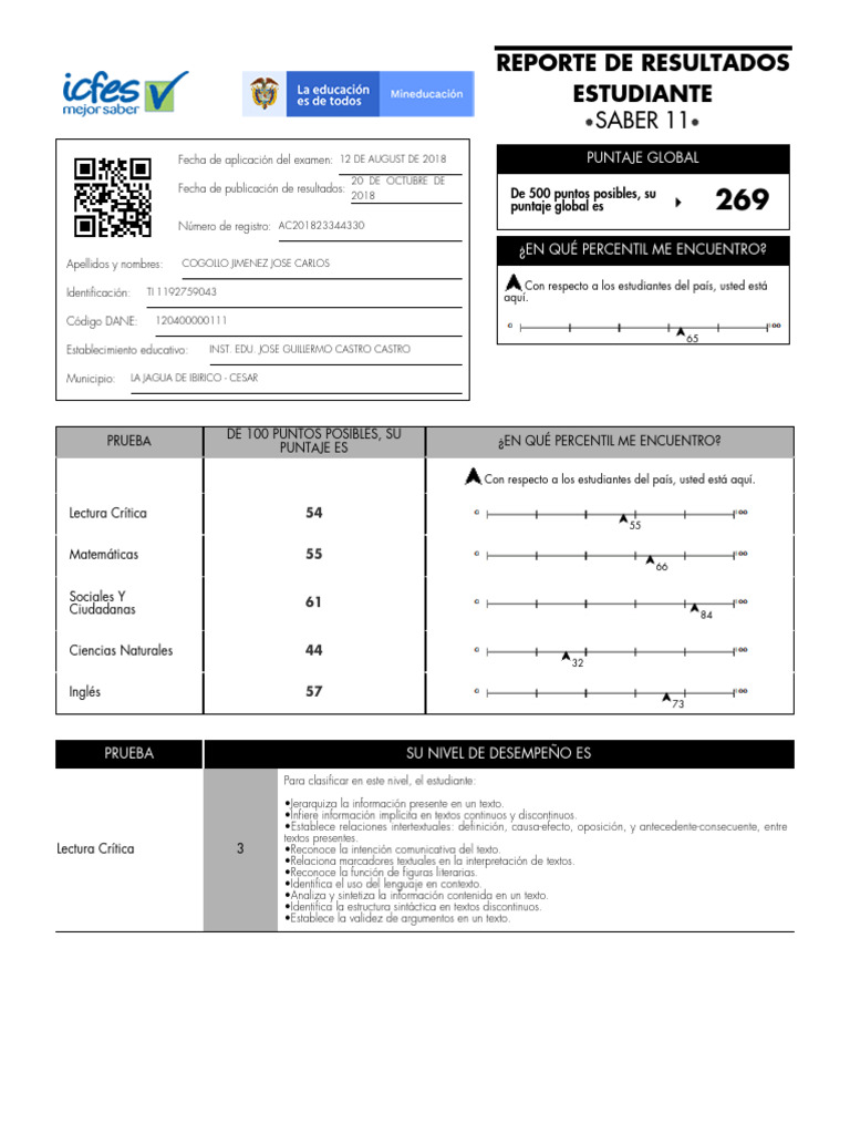 Fecha de aplicación del examen: 12 DE AUGUST DE 2018 PUNTAJE GLOBAL