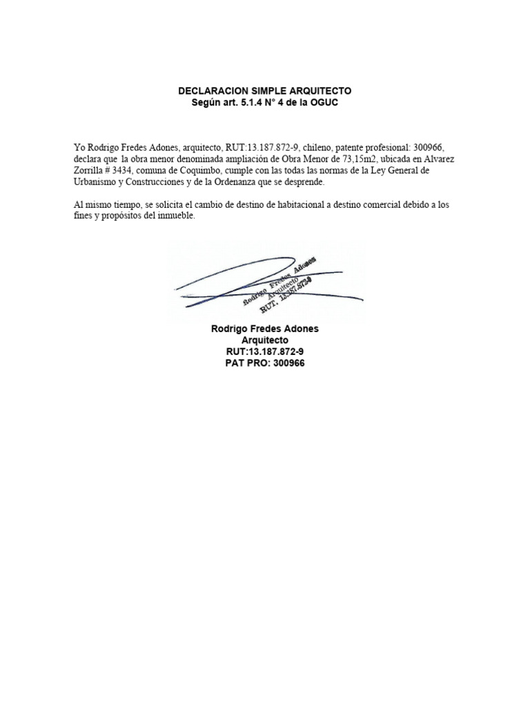 Yo Rodrigo Fredes Adones, arquitecto, RUT:13.187.872-9, chileno, patente profesional: 300966,