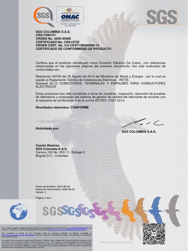 Certifica que el producto identificado como Conector Eléctrico De Cobre., con referencias