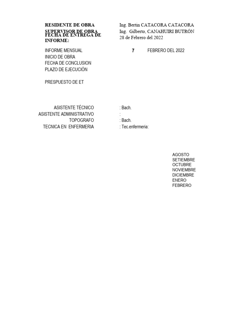 Informe Mensual de Obra en Pisacoma
