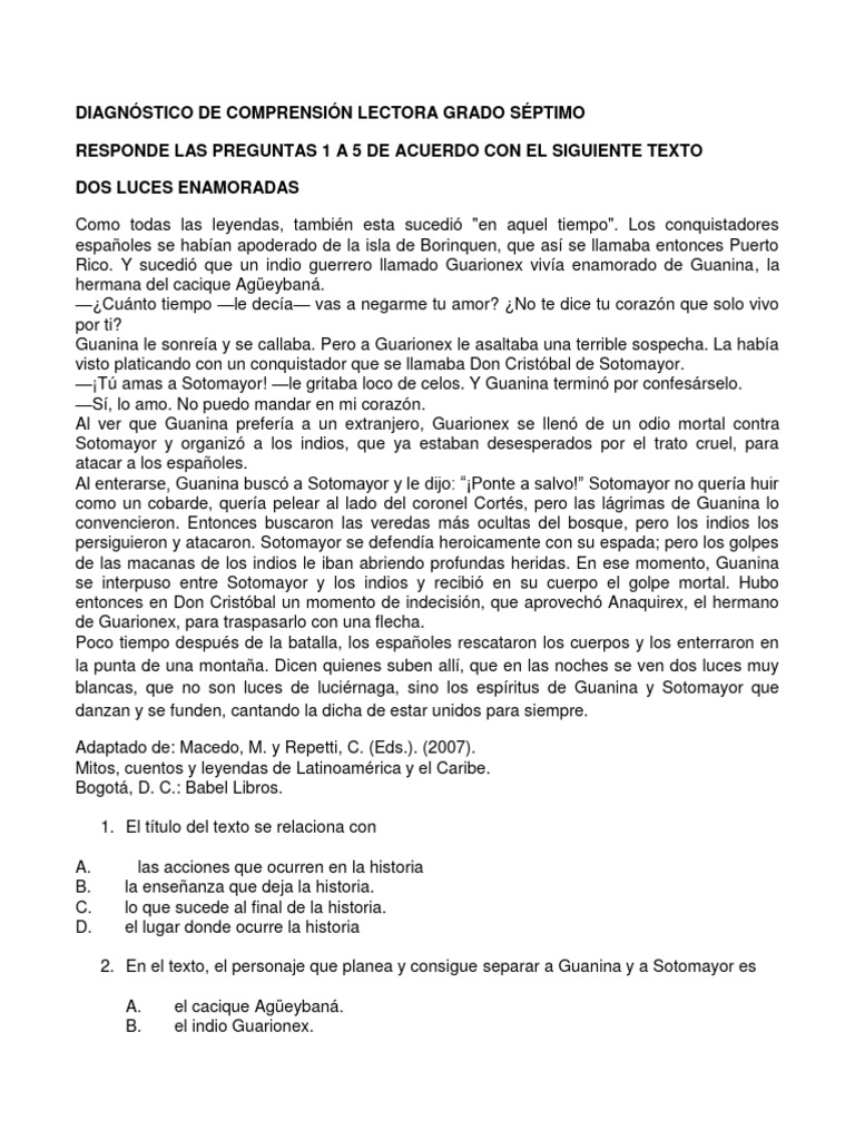 DIAGNÓSTICO DE COMPRENSIÓN LECTORA GRADO SÉPTIMO